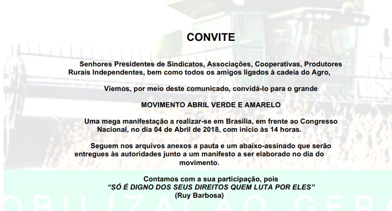 Por fim, RECLAMAMOS nosso direito a um ambiente de negócios SEGURO e ESTÁVEL, que respeite o DIREITO DE PROPRIEDADE e nos possibilite continuar trabalhando e produzindo alimentos pelo bem da ECONOMIA nacional e pelo PROGRESSO do povo brasileiro.