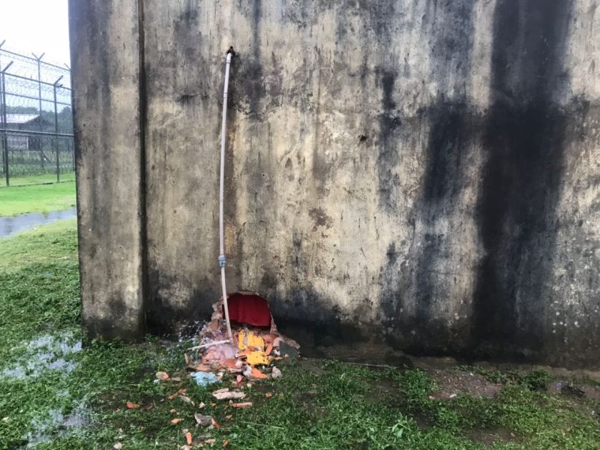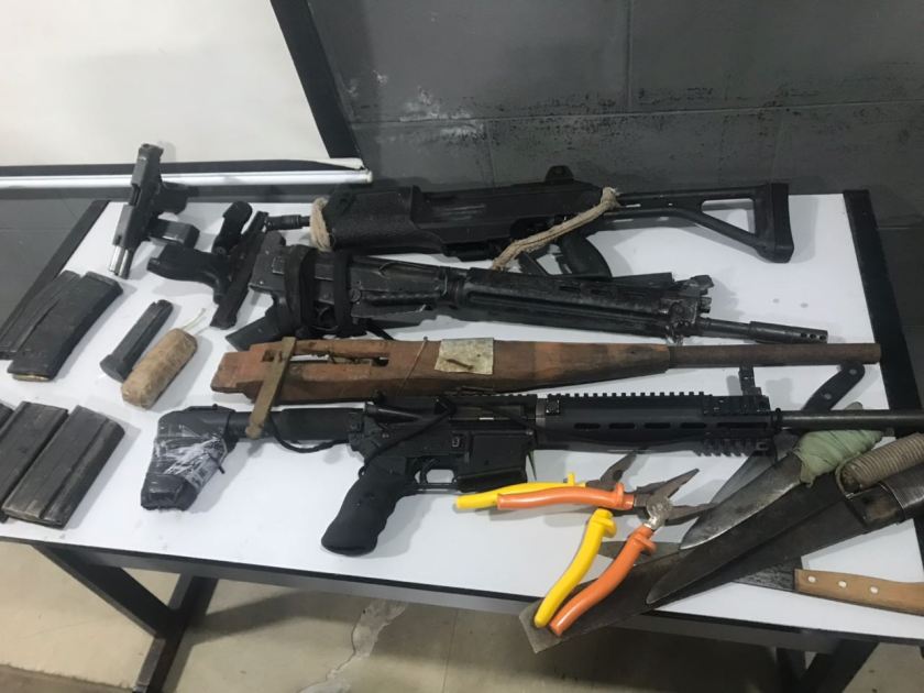 Fotos do presídio que circulam nas redes sociais, com o armamento apreendido e os buracos feitos no muro com explosivos: