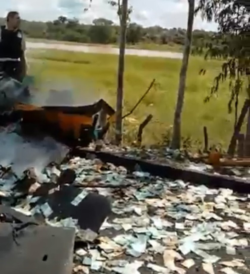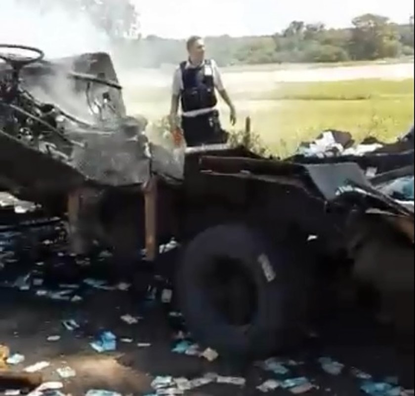 A força da explosão destruiu por completo o carro-forte e espalhou o dinheiro que estava em malotes pela pista.