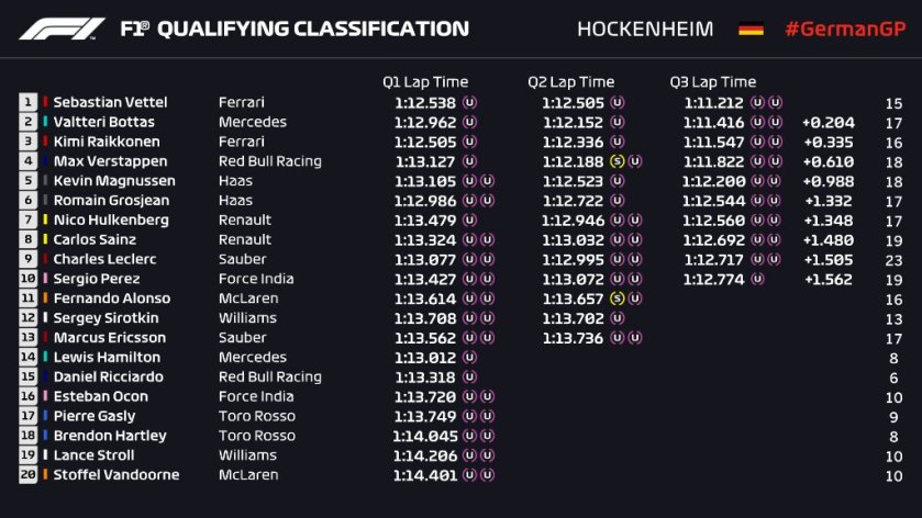 Sobrou para o alemão Sebastian Vettel satisfazer a sua torcida e cravar a pole-position para o GP da Alemanha, em Hockenheim. Correndo em casa, ele garantiu a alegria da Ferrari com o recorde de volta a 1min11s539 e ainda teve mais motivos para comemorar com a zica na Mercedes do rival pelo título, Lewis Hamilton. Valtteri Bottas ficou em segundo, com Kimi Raikkonen em terceiro, o finlandês perdendo a chance de largar na frente ao errar na última curva.