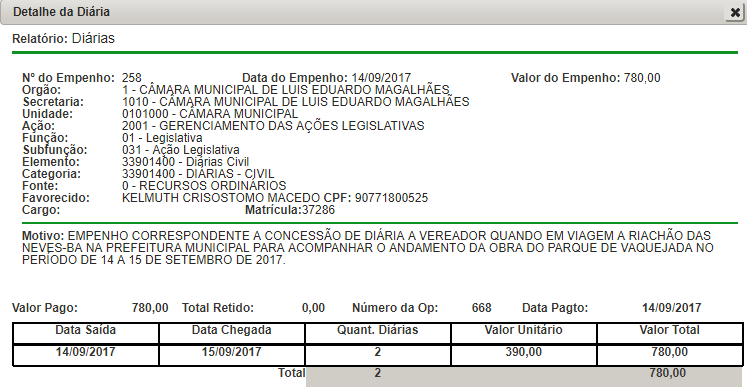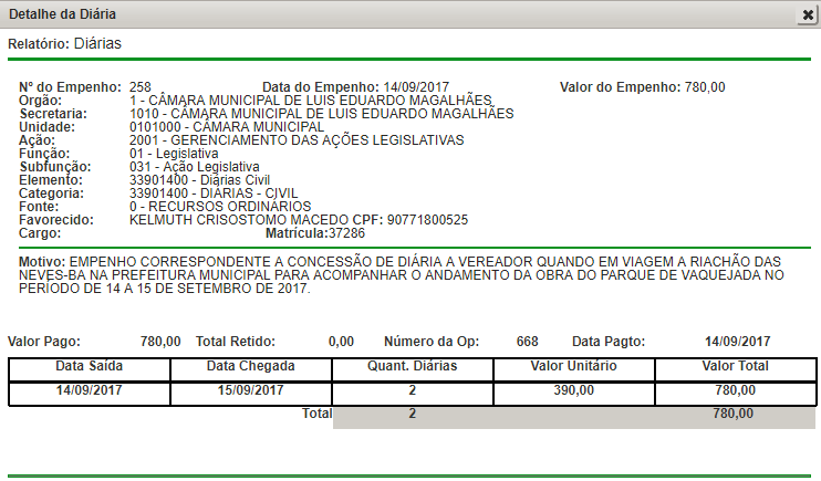 Detalhe da Diária Vereador Kelmuth
