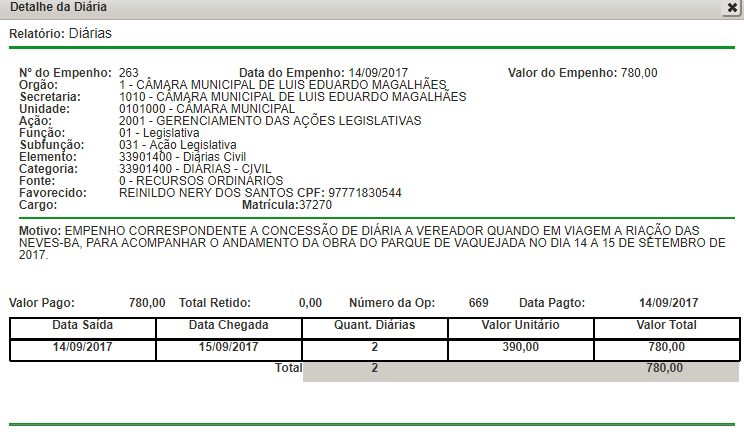 Detalhe da Diária Vereador Reinildo Nery
