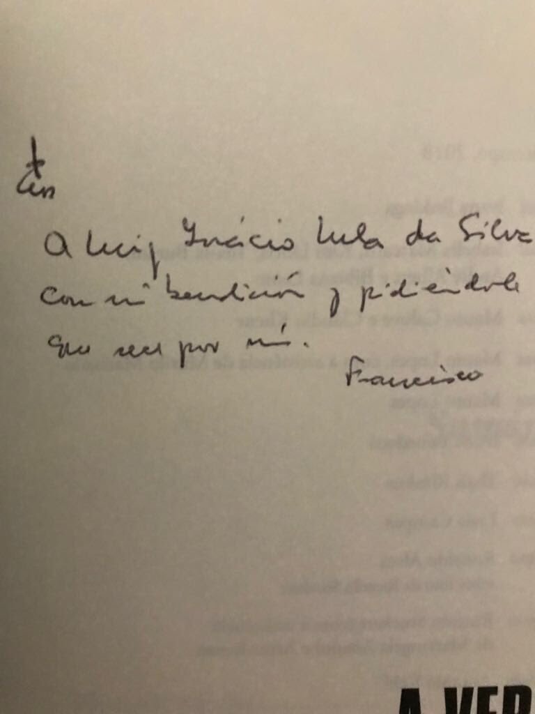 “A Luiz Inácio Lula da Silva com a minha bênção, pedindo-lhe para orar por mim, Francisco”. Isso é o que diz a mensagem do Papa Francisco ao ex-presidente Lula da Silva, preso em Curitiba.