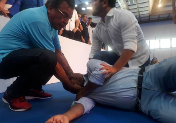 O vereador baiano Vado Malassombrado passou por um susto na manhã desta quinta-feira (2), durante convenção do DEM para lançar a candidatura de Zé Ronaldo ao Governo do Estado. O edil machucou o ombro ao cair do palanque do evento e precisou ser socorrido.
