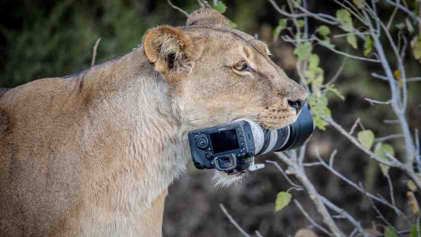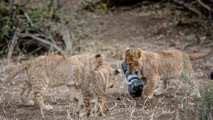 Uma leoa da reserva de Mashatu, em Botsuana, África, provavelmente líder de seu grupo, acabou com a confusão e tomou entre os dentes o caríssimo equipamento de um fotógrafo ousado que fazia reportagem com seus filhotes. A sorte do fotógrafo é que ele tinha máquinas de reserva e conseguiu os flagrantes. Os filhotes se divertiram com o novo brinquedo. Fotos VCG.