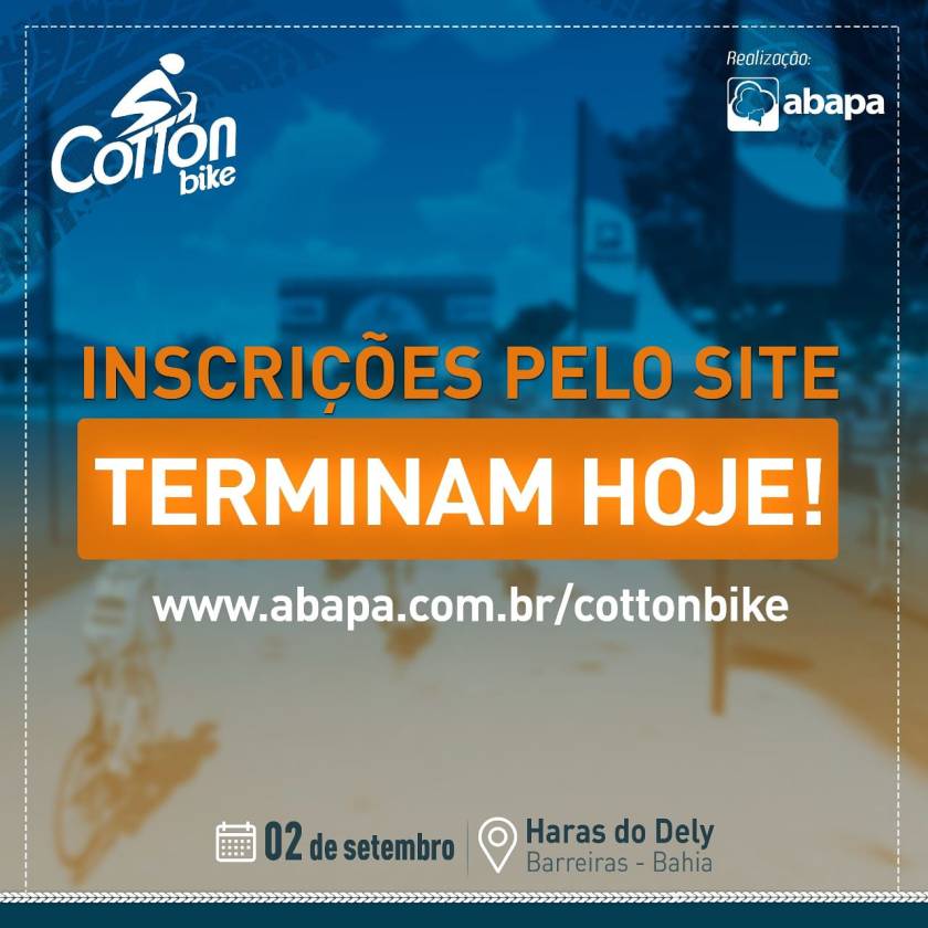 Ciclistas, corram. Hoje é o último dia de inscrições da Cotton Bike Barreiras pelo site http://www.abapa.com.br/cottonbike. E, presencialmente na Abapa Barreiras, até amanhã, sexta-feira (31). O evento é organizado pela Abapa e vai levar uma mega estrutura para os atletas e visitantes.