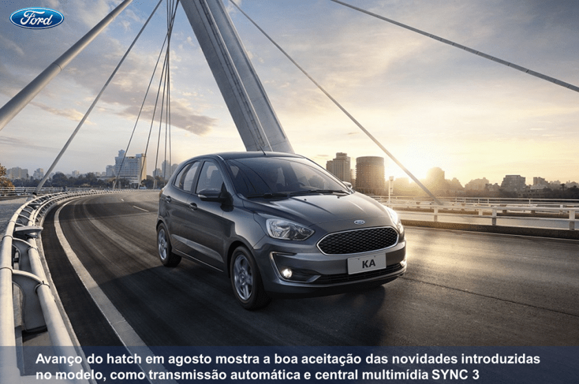 O Ford Ka registrou o maior volume do ano em agosto, mês que marcou o início de vendas da linha 2019. O hatch somou 10.095 emplacamentos e se consolidou na vice-liderança do mercado, mostrando a boa aceitação das novidades introduzidas no modelo.