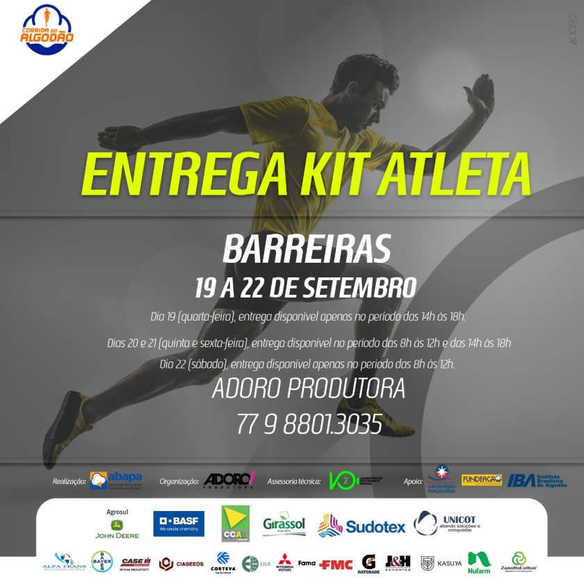 Está chegando a corrida para quem tem fibra. No dia 29 deste mês, a partir das 18h, a Associação Baiana dos Produtores de Algodão realiza a 2ª edição da Corrida do Algodão. E os atletas que forem retirar os kits em Barreiras devem observar o período da entrega, que será de quarta-feira (19) até o sábado (22), na Adoro Produtora, em horários pré-determinados. O kit atleta é composto pelo número com chip, camiseta e copo, tudo dentro de uma ecobag 100% algodão, como parte da campanha “Sou de Algodão”, da Abapa, que incentiva o uso da matéria prima no vestuário e na moda brasileira