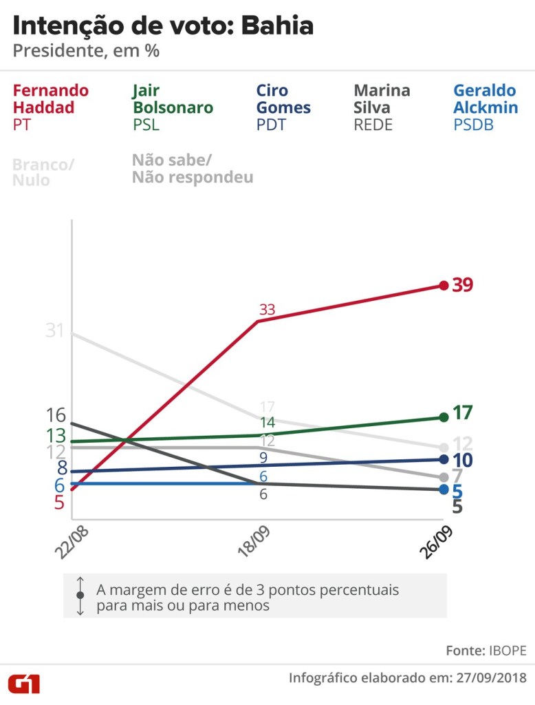 A Bahia tem 10.393.170 eleitores aptos nestas eleições. A serem verídicas as informações do IBOPE divulgadas ontem, Haddad com 39% e Bolsonaro com 17%, o candidato petista sai da Bahia com uma diferença de 22% dos votos, algo em torno de 2.286.497 votos.