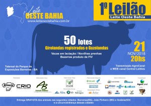 Além do Encontro, na noite do dia 21 de novembro, a partir das 20h, acontecerá o 1º LEILÃO LEITE OESTE BAHIA, no Tatersal do Parque de Exposições Barreiras. O leilão será transmitido pelo Agro Canal e Web canal Central Leilões e, contará com 50 lotes de matrizes da raça Girolandas e Guzolandas, registradas (bezerras produtos de fecundação In Vitro -FIV, novilhas prenhas e vacas em lactação), como uma mostra da oferta de animais geneticamente superiores disponíveis na região.