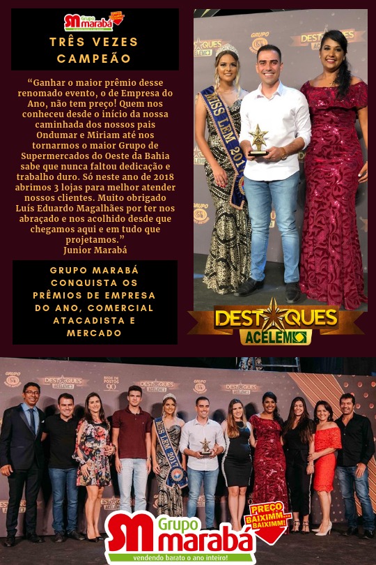 Com muita alegria e orgulho, na noite de sábado, 08 de dezembro, o Grupo Marabá conquistou três prêmios no evento Destaques do Ano da ACELEM, incluindo o mais disputado, de Empresa do Ano. O grupo também conquistou reconhecimento como Comercial Atacadista e Mercado. “Ganhar o maior prêmio desse renomado evento, o de Empresa do Ano, não tem preço! Quem nos conheceu desde o início da nossa caminhada, ainda na época em que nossos pais, Ondumar e Miriam, chegaram na cidade, sem saber o que fazer, com três filhos pra criar, sabe que é uma grande conquista chegar em um patamar como esse, nos tornando o maior Grupo de Supermercados do Oeste da Bahia”, comemorou Junior Marabá, um dos sócios do grupo