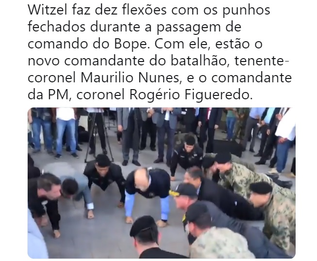 Agora está na moda, mostrar macheza fazendo flexões em público. Para um ex-juiz de direito e Governador do Rio de Janeiro, Witzel está mais para garoto propaganda de academia de ginástica. Vivemos tempos lamentáveis.