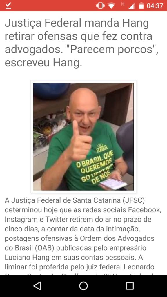 O empresário fascista e de passado obscuro no porto de Navegantes, em Itajaí, vai enfrentar uma dura luta na Justiça contra a Ordem dos Advogados do Brasil. Advogados de todo o Brasil estão indignados com as imbecilidades do empresário.