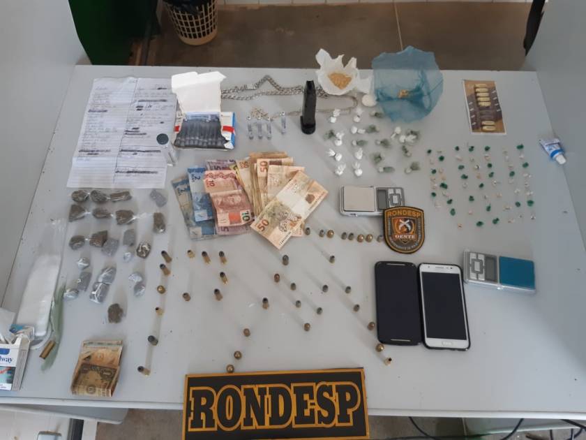 No primeiro momento os PMs localizaram 21 porções de maconha na área de serviço. Em outra parte da casa, um segundo homem foi abordado. Percebendo o nervosismo do suspeito as equipes fizeram uma busca minuciosa e encontraram, dentro de um banco de madeira, munições dos calibres 40 e 38, carregador de pistola, R$ 700, balanças, celulares e substâncias para mistura de entorpecentes.