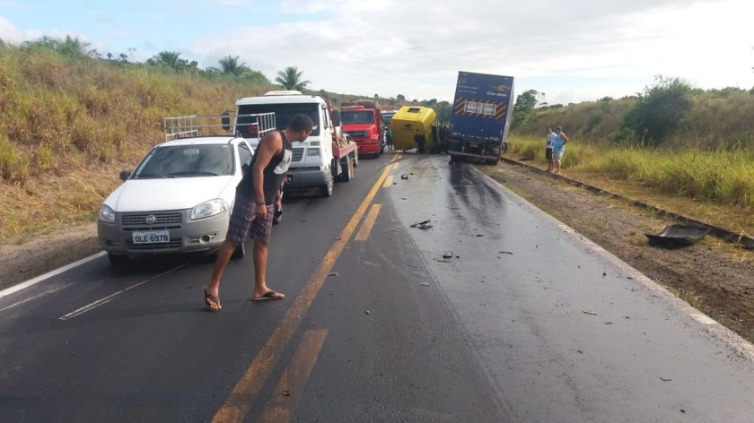 De acordo com informações da Polícia Rodoviária Federal (PRF), duas carretas bateram de frente e, após a colisão, a motocicleta em que estavam as vítimas foi atingida.
