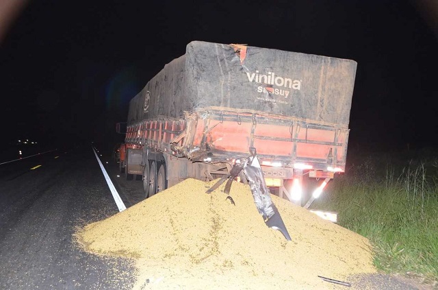 Por conta do acidente, a carga de soja transportada pelo caminhão que freou bruscamente ficou espalhada em parte da pista.