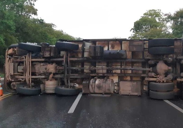 Caminhão tomba, fica atravessado na pista e interdita trecho da BR-242