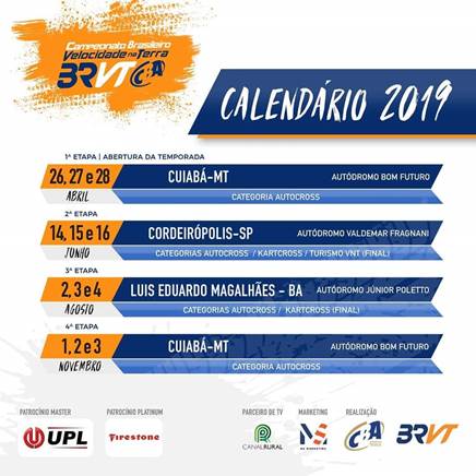A abertura do circuito abrange a categoria AutoCross e acontecerá entre os dias 26 e 28 de abril no autódromo Bom Futuro, em Cuiabá (MT). A segunda etapa será disputada na cidade paulista de Cordeirópolis, que receberá as três categorias. Já entre os dias 02 e 04 de agosto, a cidade de Luís Eduardo Magalhães, localizada no Oeste da Bahia, receberá as corridas de Autocross e Kartcross. Encerrando o calendário, o BRVT voltará para Cuiabá para a grande decisão da categoria AutoCross durante os dias 01, 02 e 03 de novembro.