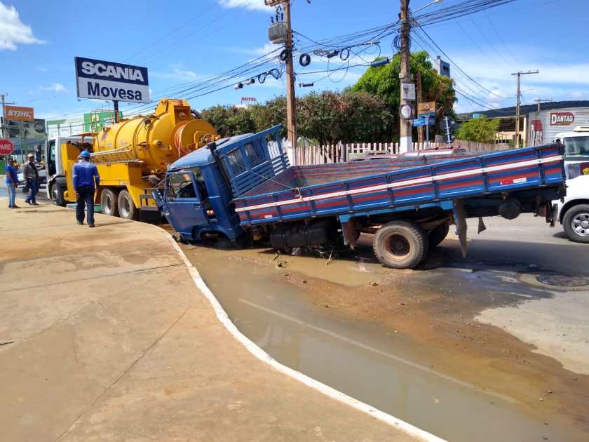 Primeiro foi um veículo VW Santana e depois foi um caminhão. A equipe do Blog do Sigi Vilares esteve no local acompanhando parte do serviço de um caminhão pipa da Embasa que estava retirando a água acumulada após os dois acidentes, para posteriormente poder retirar o caminhão do buraco.