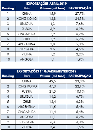 Abaixo, a lista de exportações – dados relativos ao mês de abril e ao primeiro quadrimestre de 2019.