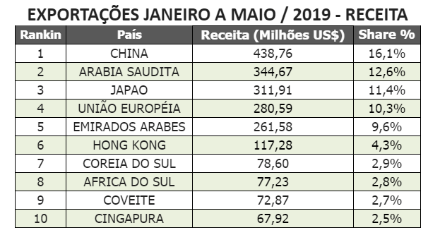 Outro destaque do mês, as vendas para os Emirados Árabes Unidos chegaram a 30,7 mil toneladas em maio (8,2% do total), saldo 49% acima do realizado no mesmo período do ano passado.