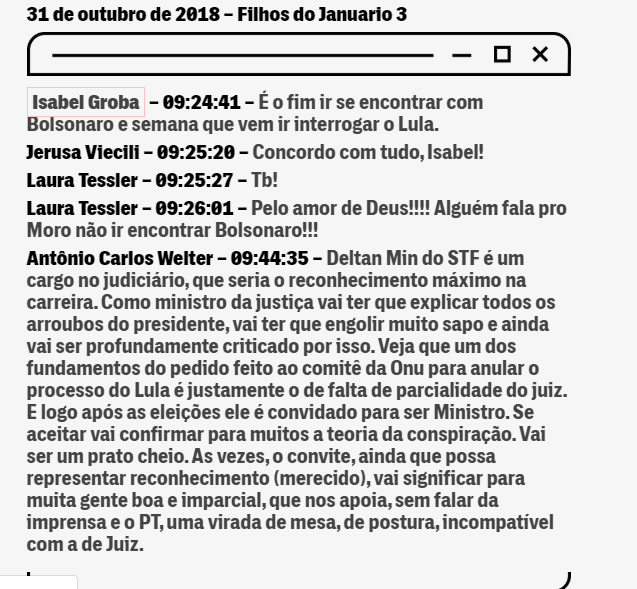 Procuradores do Ministério Público Federal, em mensagens privadas trocadas em grupos com integrantes da Lava Jato, criticaram Sergio Moro duramente pelo que consideraram uma agenda pessoal e política do juiz. Eles foram além no decorrer e logo depois da campanha eleitoral de 2018: para os procuradores, Moro infringia sistematicamente os limites da magistratura para alcançar o que queria.