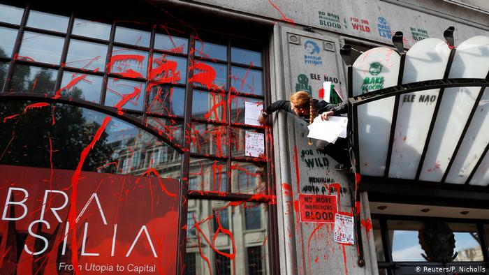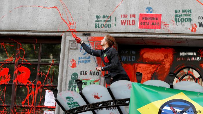 Ambientalistas protestaram contra as políticas ambientais do governo de Jair Bolsonaro nesta terça-feira (13/08) em Londres, jogando tinta vermelha na fachada da embaixada brasileira.