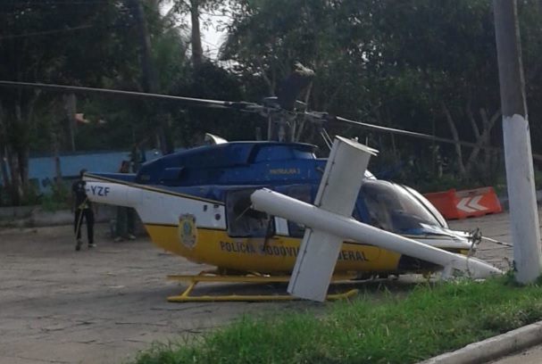 Três policiais que estavam a bordo da aeronave não se feriram, mas o helicóptero ficou destruído, depois de bater com o rotor traseiro numa placa de sinalização.