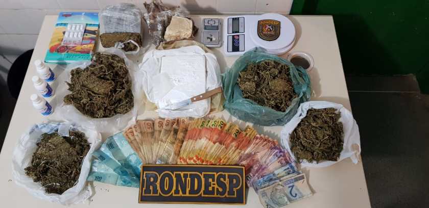 Diante da denúncia, a equipe policial deslocou ao local indicado e após realizar uma busca de perímetro sentiu um forte cheiro de maconha. Ao prosseguir com as buscas foram localizados os seguintes materiais ilícitos no local indicado na denúncia: 230 gramas de crack; 1,512Kg de maconha; 840 gramas de cocaína; 02 balanças de precisão; 03 recipientes de álcool etílico; 01 cartela de paracetamol; 01 caderno de anotações; além de R$ 3.710,00 em espécie.