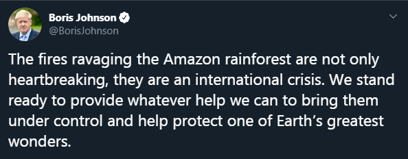 Os incêndios devastando a floresta amazônica não são apenas devastadores, são uma crise internacional. Estamos prontos para fornecer qualquer ajuda que pudermos para controlá-los e ajudar a proteger uma das maiores maravilhas da Terra.