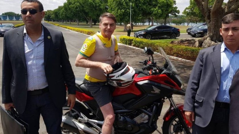 Com uma camisa dos Las Palmas, time da liga espanhola, Jair Bolsonaro andou de moto no terreno do palácio e parou para falar com visitantes. Após uma sessão de fotos com apoiadores, o presidente não hesitou em revidar ao questionamento do ciclista e, logo depois, colocou o capacete e foi embora.