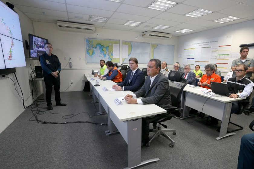O governador Rui Costa se reuniu, na tarde desta segunda-feira (21), com o vice-almirante André Luiz Santana, comandante do 2º Distrito Naval, e com o ministro de Desenvolvimento Regional, Gustavo Canuto para discutir novas ações de análise das manchas de óleo no litoral baiano, seus impactos socioambientais, as causas e soluções para o problema que atinge todo o nordeste. O encontro aconteceu no Comando do 2º Distrito Naval, no bairro do Comércio, em Salvador.