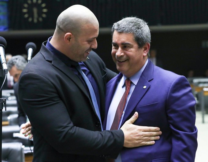 Daniel Silveira, que quebrou a placa em homenagem a Marielle Franco, cumprimenta Coronel* Tadeu, que rasgou charge que denunciava o genocídio da povo negro. Retrato de dois crápulas que serão lembrados pela história como subproduto fétido desses tempos sombrios.
