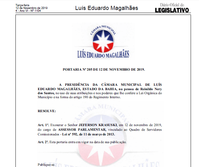 Demorou exatos 60 dias, mas aconteceu. O cidadão Jeferson Krasuski, que mora em Getúlio Vargas, no Rio Grande do Sul, a 2.289 quilômetros de Luís Eduardo Magalhães foi exonerado da função de assessor do vereador Elton Alves de Almeida, o Eltinho.