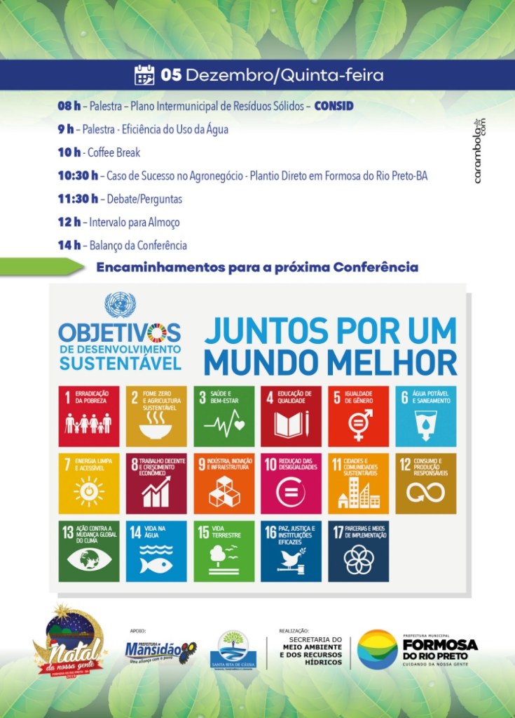 Sustentabilidade é o tema da II Conferência Ambiental do Vale do Rio Preto que acontece nos dias 4 e 5 de dezembro, no Espaço Premium, em Formosa do Rio Preto. Evento realizado pela Prefeitura de Formosa, através da Secretaria Municipal do Meio Ambiente e dos Recursos Hídricos, com apoio das Prefeituras de Santa Rita de Cássia e Mansidão.
