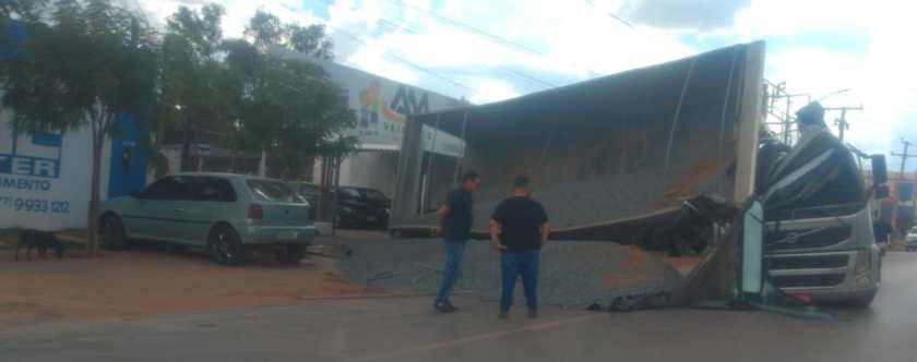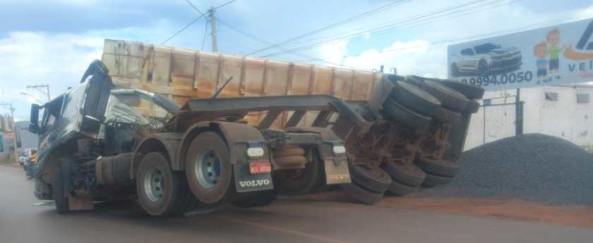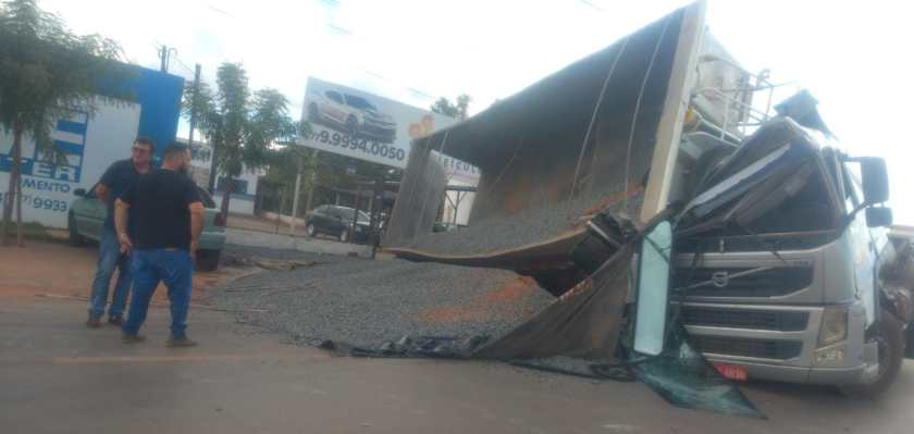 Caçambão LS tomba carroceria sobre a cabine da carreta