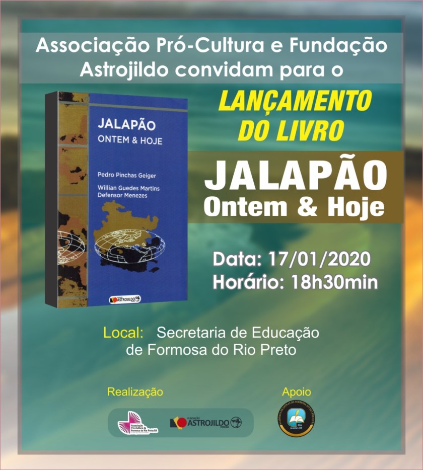 Formosa do Rio Preto será palco, nesta sexta-feira (17/01), do lançamento do livro “Jalapão: ontem e hoje” de autoria dos geógrafos Pedro Pinchas Geiger e Willian Guedes M. D. Menezes. O evento será realizado pela Associação Pró-Cultura e Fundação Astrojildo Pereira (FAP) com o apoio da Academia de Letras de Formosa do Rio Preto (Alef), no Auditório da Secretaria Municipal de Educação, na Avenida Bahia, S/N, às 18h30min.