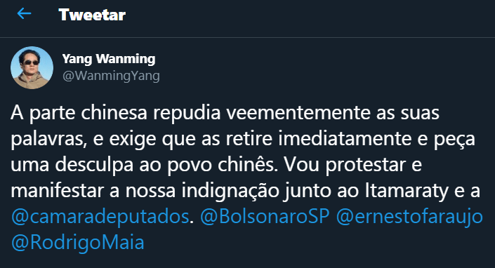 Por meio de seu embaixador no Brasil, Yang Wanming, o país asiático, que é o principal parceiro comercial do Brasil, manifestou veemente repúdio a uma declaração do deputado, chegando a dizer que o filho do presidente Jair Bolsonaro “contraiu um vírus mental” em Miami.