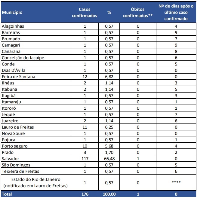 A Secretaria da Saúde do Estado (Sesab) ressalta que os números são dinâmicos e na medida em que as investigações clínicas e epidemiológicas avançam, os casos são reavaliados, sendo passíveis de reenquadramento na sua classificação. Outras informações estão disponíveis no site da Sesab.