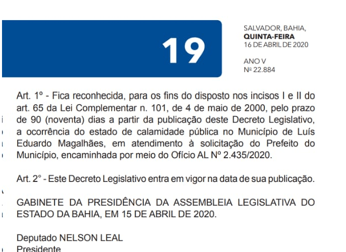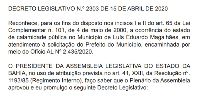 O decreto expedido pelo prefeito se sobrepõe ao pedido de reconhecimento pela Assembleia Legislativa do Estado da Bahia, que reconheceu, através do Decreto Legislativo 2303, de 15 de abril, o Estado de Calamidade Pública solicitado, pelo prazo de 90 dias.