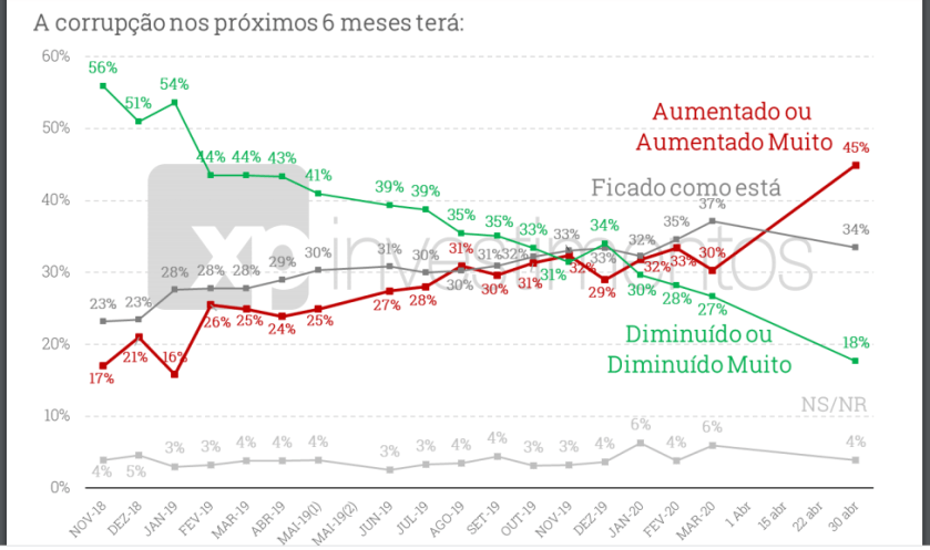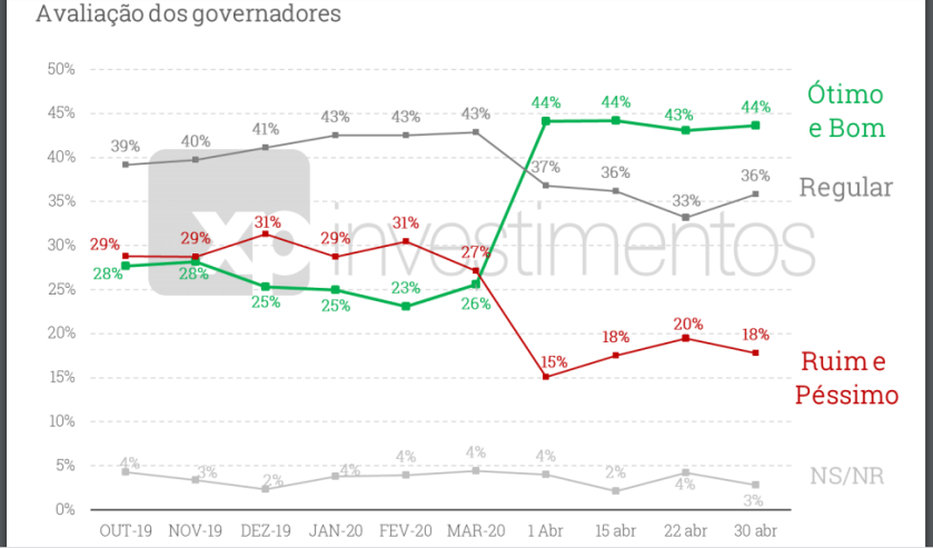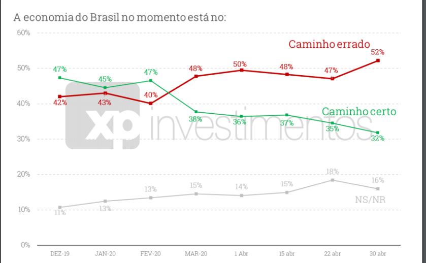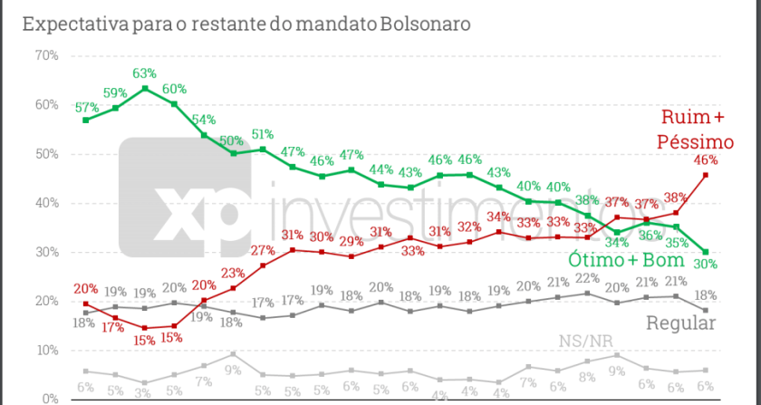 A nova rodada da pesquisa XP Ipespe, concluída na última quinta-feira, revela que, desde o pedido de demissão de Sergio Moro, em 24 de abril, a avaliação positiva do governo Jair Bolsonaro caiu 4 pontos percentuais, de 31% para 27%, enquanto a avaliação negativa saltou 7 pontos percentuais, de 42% para 49%. Os valores são, respectivamente, o menor e o maior da série iniciada em janeiro de 2019.