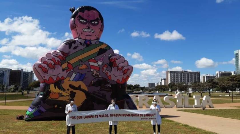 “Os que lavam as mãos,o fazem numa bacia de sangue”, diz a frase do dramaturgo Bertolt Brecht, escrita em uma faixa segurada por três pessoas vestindo jaleco e com máscara de proteção.