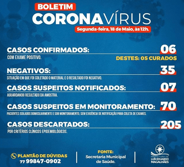 A Prefeitura de Luís Eduardo Magalhães confirmou, agora à tarde, o sexto caso positivo de COVID-19 (Coronavírus), no município. Trata-se de uma pessoa do gênero masculino de 64 anos, trabalha com transporte de cargas, autônomo, chegou no município há 90 dias e sem história de contato com caso suspeito ou confirmado.