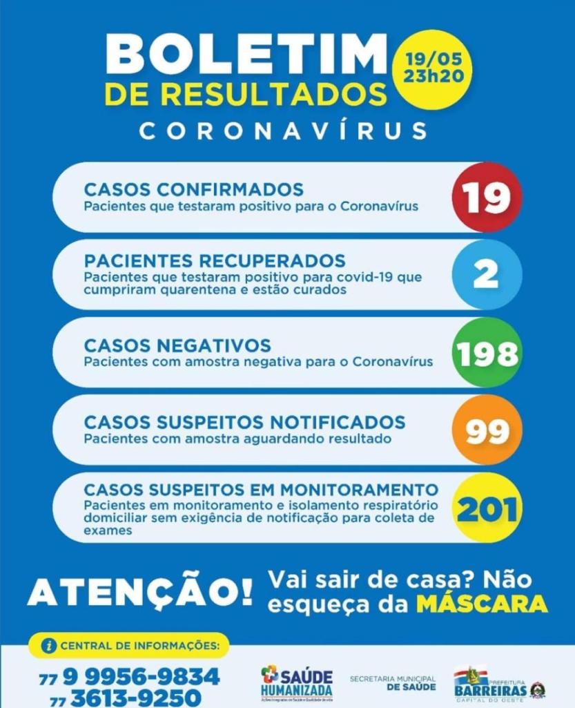 A Secretaria de Saúde de Barreiras informa que hoje, 19, foram identificados 22 (vinte e dois) novos casos com características que indicam suspeição de Coronavírus (COVID-19), preenchendo os critérios indicativos para coleta.