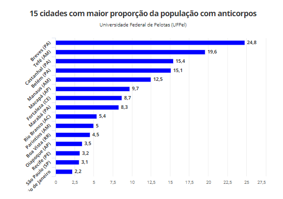 A partir dos resultados dos testes, os pesquisadores calculam que um total de 760 mil brasileiros nestas áreas foram infectados. Na véspera da pesquisa, os números oficiais apontavam, nestas 90 cidades, 104.792 casos confirmados do coronavírus, e 7,6 mil mortes.