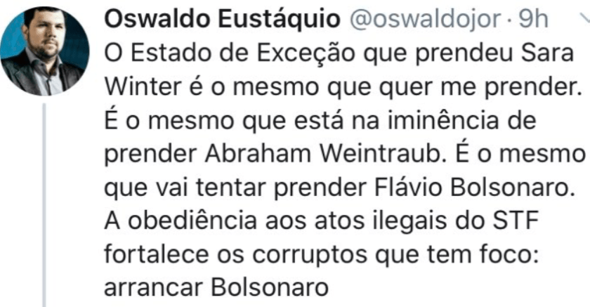 “Tenho perguntas sobre a investigação Fake News e preocupações com as tentativas do governo de controlá-la, mas, neste caso, prenderam um dos bolsonaristas mais imundos, desonestos e tóxicos”, disse hoje pela manhã o jornalista Glenn Greenwald, do The Intercept.