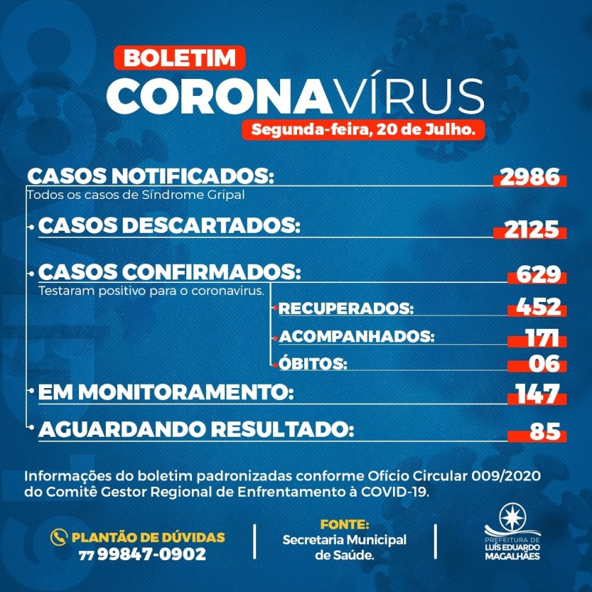 A Secretaria da Saúde informa ainda que no dia de hoje foram concluídos 73 (setenta e três) resultados, sendo que 11 (onze) testaram negativo e 62 (sessenta e dois) testaram positivo.