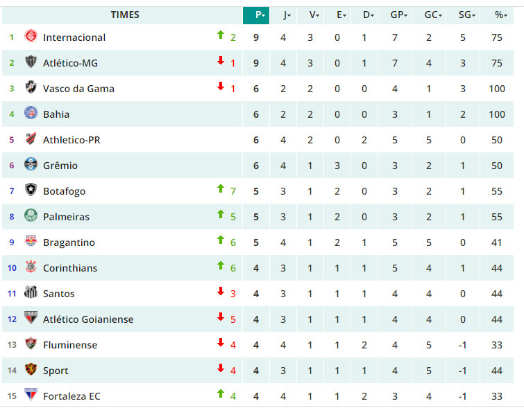 Depois de derrotar por 3×0, ontem à noite no Beira Rio, o Atlético-GO, o Internacional assumiu a liderança do Brasileirão, depois da derrota surpreendente do Atlético-MG para o Botafogo, no Estádio Nilton Santos, por 2×1. Vasco e Bahia tem dois jogos a menos, jogam hoje e podem ultrapassar o time gaúcho.