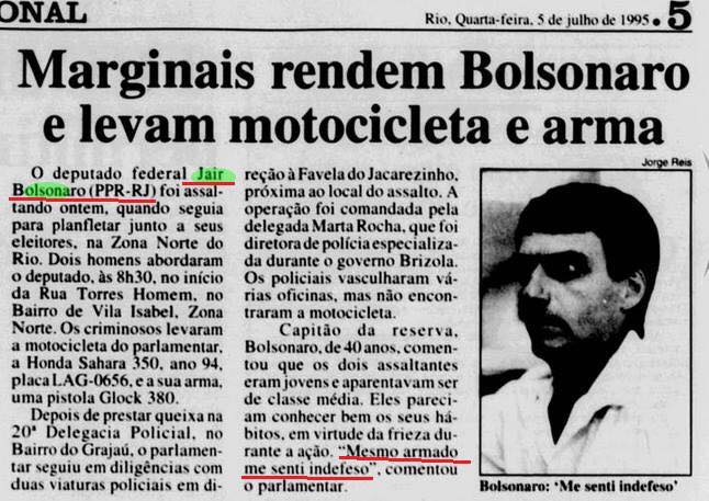 Em 1995, Jair Bolsonaro, de arma na cintura, foi assaltado e perdeu a Glock 380 e uma moto.