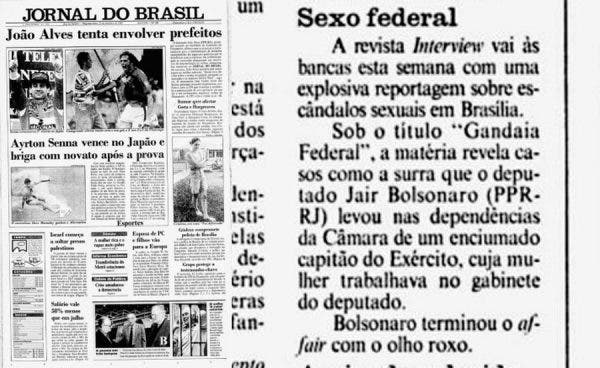 Aos 38 anos, Jair Bolsonaro ficou com o olho roxo de porrada que levou de um capitão cuja esposa trabalhava em seu gabinete de Bolsonaro. Ela foi assediada na ocasião. Esse fato consta no Informe JB de 25 de outubro de 93.